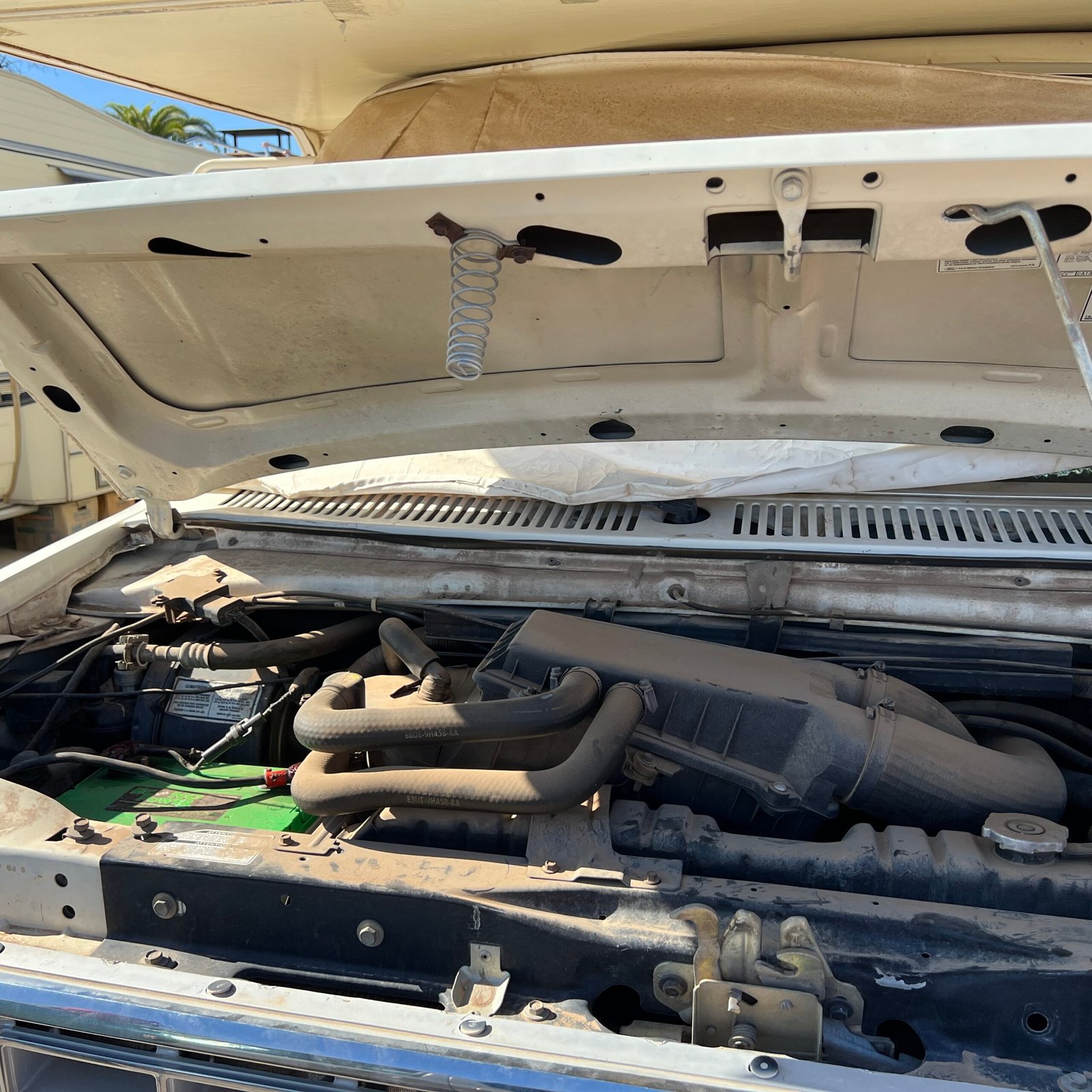 2. It runs. Just started it up today. It runs on gas (not diesel) and that awesome Ford 350 motor is super reliable. It has less than 60,000 miles on the gauge. I recently put two rebuilt batteries in it and I replaced the tires when I bought it. (They alone cost around $1,000.) It doesn’t overheat. It does have a power-steering leak and a couple little quirks like the right blinker won’t stay on, but it is drivable now (but sold “as is”).